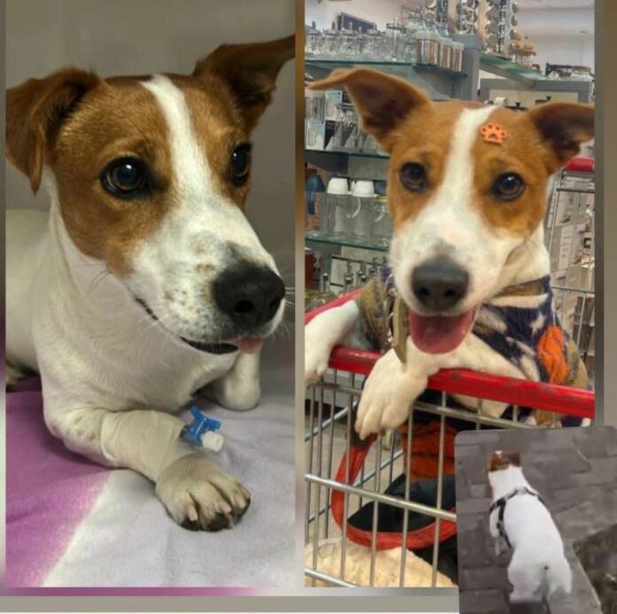 Jack tem corpinho branco, orelhas caramelo e manchas caramelo ao redor dos olhos. É dócil, pode estar assustado e a família segue em buscas constantes.