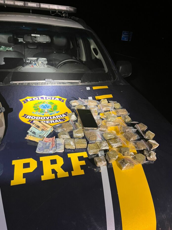 Na noite desta segunda-feira (25), a Polícia Rodoviária Federal prendeu um jovem de 22 anos que transportava aproximadamente 1 quilo de maconha no km 519 da BR-116.