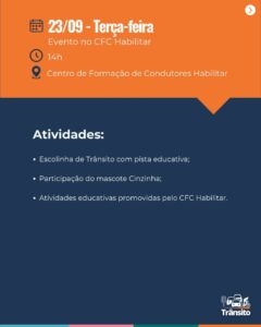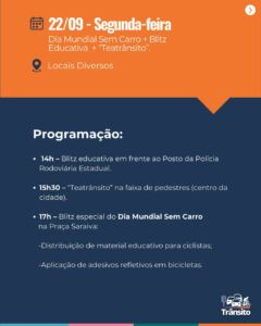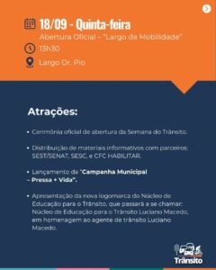 A abertura oficial acontece na quinta-feira (18), às 13h30, no Largo Dr. Pio, com o evento “Largo da Mobilidade”. Na ocasião, será lançada a Campanha Municipal – Pressa + Vida e apresentada a nova identidade visual do Núcleo de Educação para o Trânsito, que passará a se chamar Núcleo de Educação para o Trânsito Luciano Macedo.