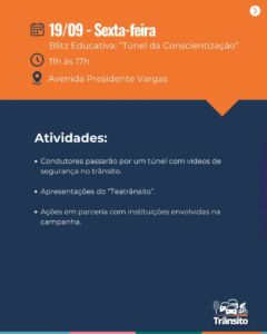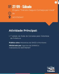 Entre as atividades previstas estão o Túnel da Conscientização (19/09), o Dia Mundial Sem Carro (22/09) e a roda de conversa “Trânsito Seguro Começa por Você” (27/09), no SEST/SENAT.