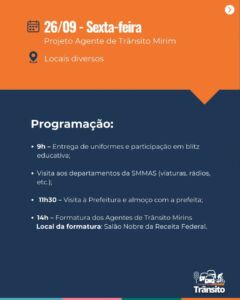 Outro destaque é o Projeto Agente de Trânsito Mirim, que ocorrerá no dia 26. Cerca de 12 crianças acompanharão o trabalho dos agentes, farão uma visita à Rádio Cultura Zona Sul, parceira da Semana do Trânsito 2025, participarão de blitze educativas, além de uma visita à Prefeitura e de um almoço com a prefeita Darlene Pereira. À tarde, será realizada a formatura de 150 alunos que participaram da iniciativa ao longo do ano, no Salão Nobre da Receita Federal.